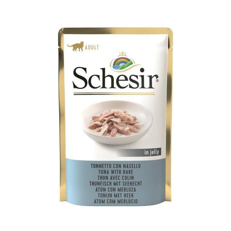 Schesir Tuńczyk z Morszczukiem Galaretce opiera się na prawdziwych filetach z pysznego tuńczyka w połączeniu z morszczukiem, rybą znaną z chudego i delikatnego białego miąższu. Dostępna w formie galaretki, która zaspokoi gusta kotów, które uwielbiają smak morza połączony z bardziej zwartą konsystencją w misce.