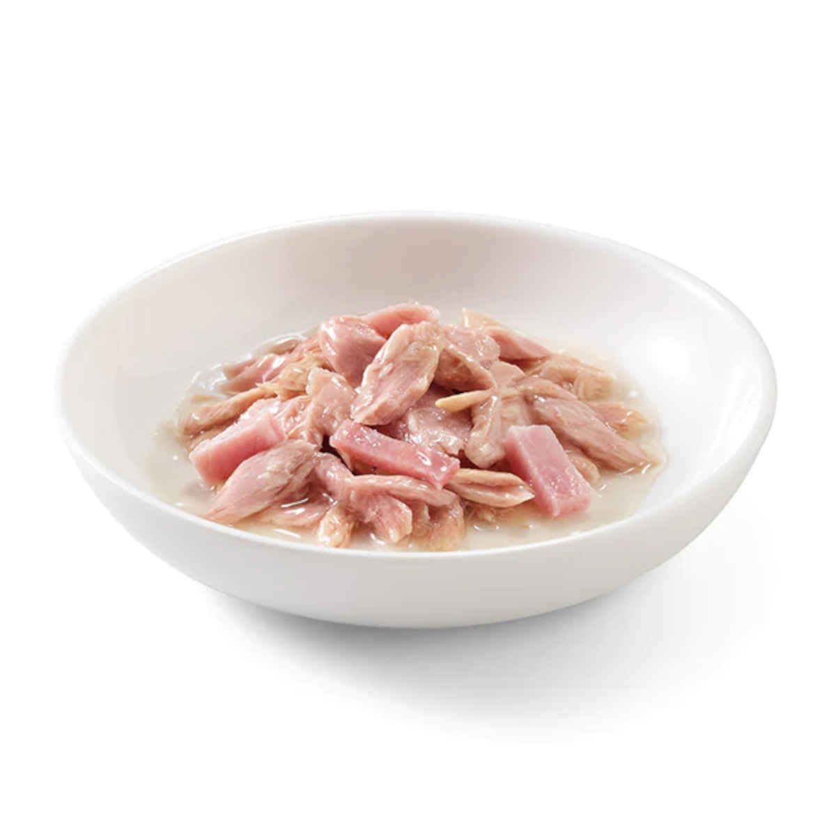 Schesir Tuńczyk z Szynką w Bulionie oparta jest na prawdziwych filetach z pysznego tuńczyka w połączeniu z smaczną szynką, co zapewnia zachęcające spotkanie smaków. Gotowana we własnym płynie, dla kotów kochających naturalny smak i konsystencję.