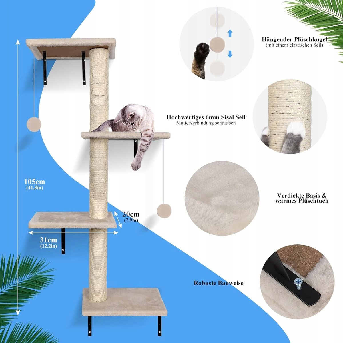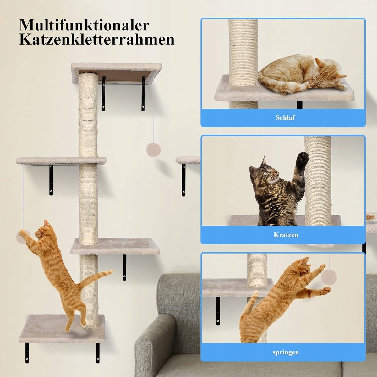 Nazwa produktu: ZNM ściana wspinaczkowa dla kotów Kolor: beżowy Materiał: lina sizalowa, pluszowa tkanina, żelazny regał na sprzęt Nośność: do 10 kg