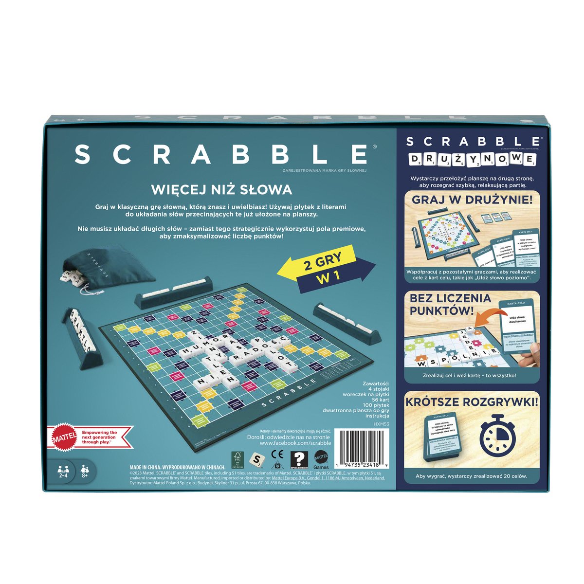 Z grą Scrabble®, która ma teraz dwa tryby rozgrywki, czeka Cię zabawa tak dobra, że brak słów! Ciesz się klasyczną rozgrywką Scrabble®, którą znasz i lubisz – układając słowa i celując w premie literowe oraz słowne. Albo przekręć planszę na drugą stronę i rozegraj partię Scrabble Drużynowych – to krótka, bardziej relaksująca wersja, w której gracze wspólnie stawiają czoła wyrazowym wyzwaniom. Zarówno nowi fani, jak i weterani słownych potyczek będą się doskonale bawić dzięki dwóm grom w jednym pudełku.