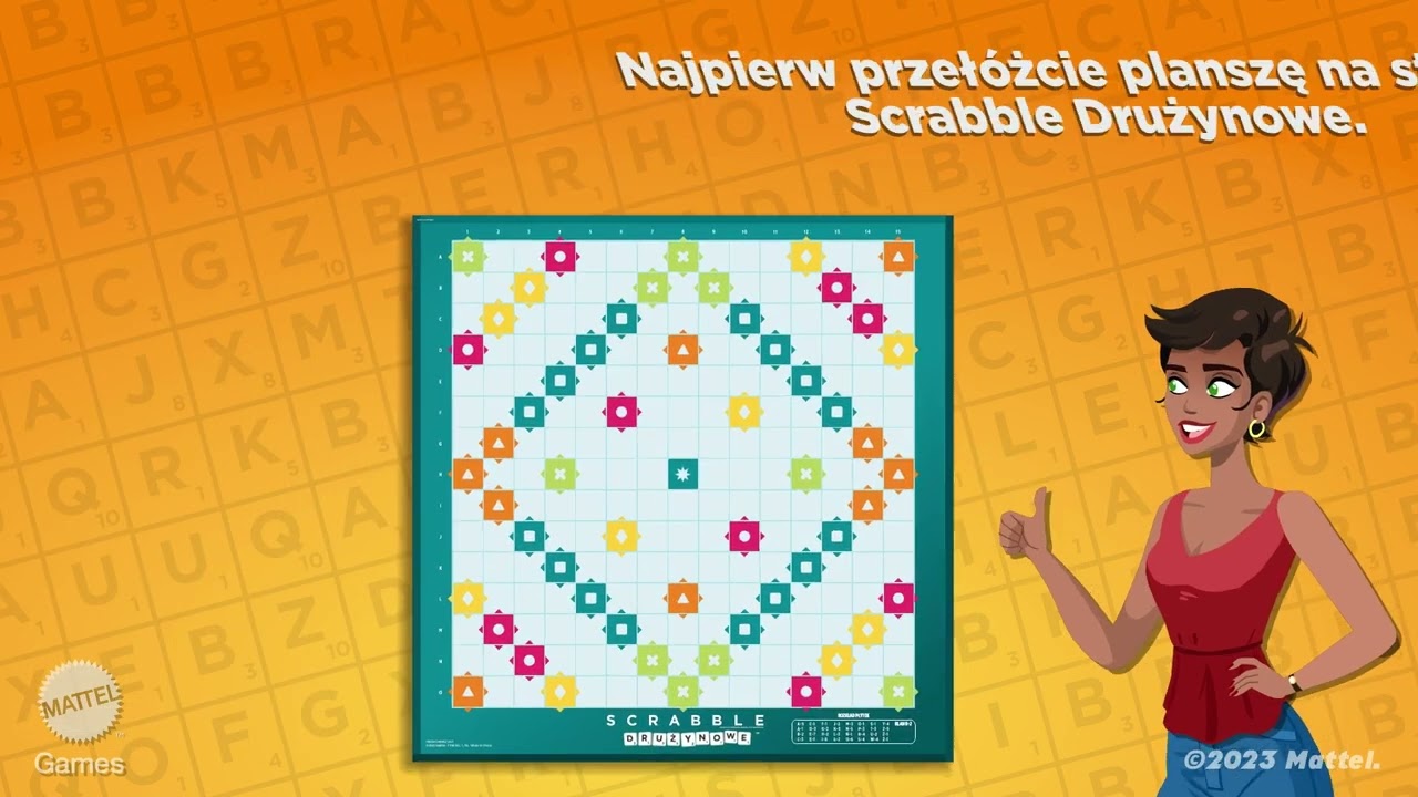 …lub przekręć dwustronną planszę i spróbuj odmiany Scrabble Drużynowe dostosowanej do szybszej, bardziej relaksującej rozgrywki, gdzie gracze współpracują, a liczenie punktów jest łatwiejsze.
