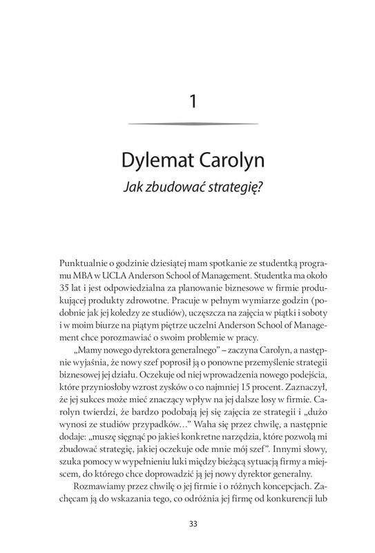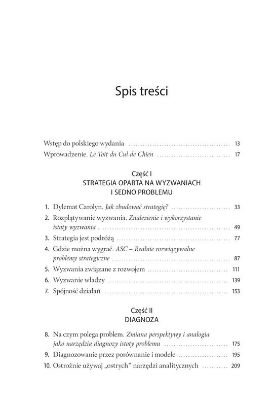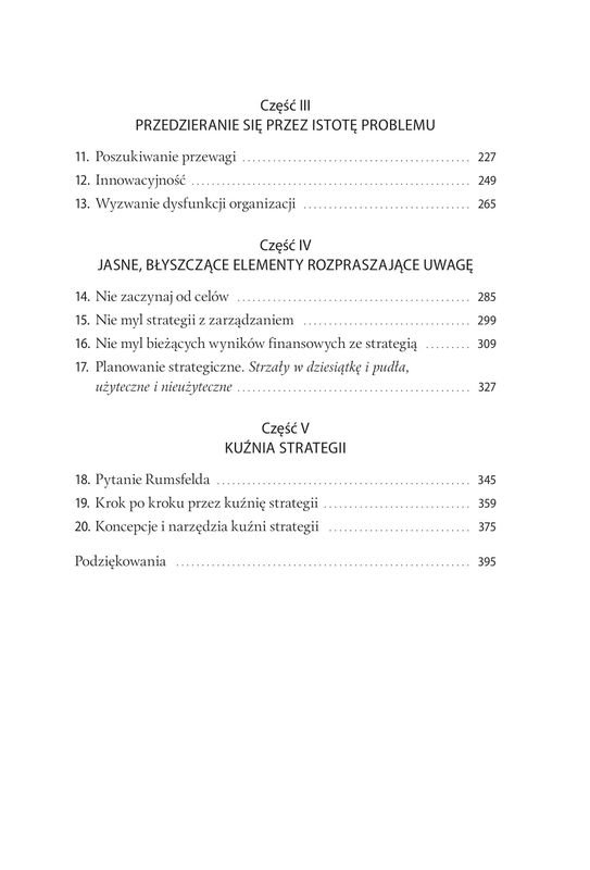 Poprzez barwne historie – o tym, jak Elon Musk skupił się na pewnym aspekcie, który napędził sukces SpaceX, czy jak amerykańska armia poradziła sobie ze słabościami swojej strategii bojowej – Rumelt prezentuje zupełnie nową koncepcję pozwalającą znaleźć sedno strategii, czyli zasadniczy problem, który trzeba rozwiązać. Pokazuje też, co się dzieje z firmami, które wpadają w inercję i nie są w stanie zmienić swojego kierunku. Udowadnia, że taki tok myślenia potrafił zgubić nawet największych, takich jak Nokia czy General Motors.