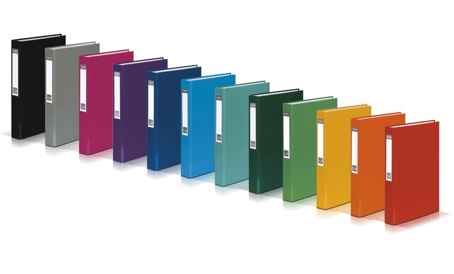 wykonany z twardej 1,8 mm tektury kolorowa oklejka pokryta folią polipropylenową z połyskiem wyklejka papierowa do formatu A4 szerokość grzbietu 40 mm mechanizm ringowy o wysokości 25 mm na 4 ...
