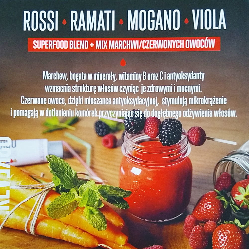 - ROSSI, RAMATI, MOGANO i VIOLA – SUPERFOOD BLEND + MIX MARCHWI i CZERWONYCH OWOCÓW – marchew bogata jest w minerały, witaminy B oraz C i antyoksydanty, wzmacnia strukturę włosów czyniąc je zdrowymi i mocnymi. Czerwone owoce dzięki mieszance antyoksydacyjnej, stymulują mikrokrążenie i pomagają w dotlenianiu komórek przyczyniając się do dogłębnego odżywienia włosów.
