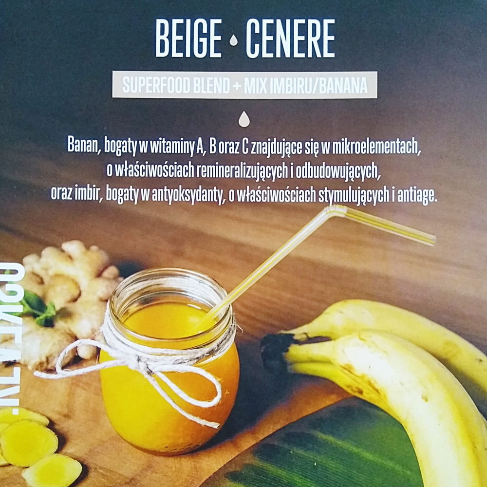 - BEIGE i CENERE – SUPERFOOD BLEND + MIX IMBIRU I BANANA – banan jest bogaty w witaminy A, B oraz C znajdujące się w mikroelementach, o właściwościach remineralizujących i odbudowujących. Imbir natomiast bogaty jest w antyoksydanty, o właściwościach stymulujących i antiage.