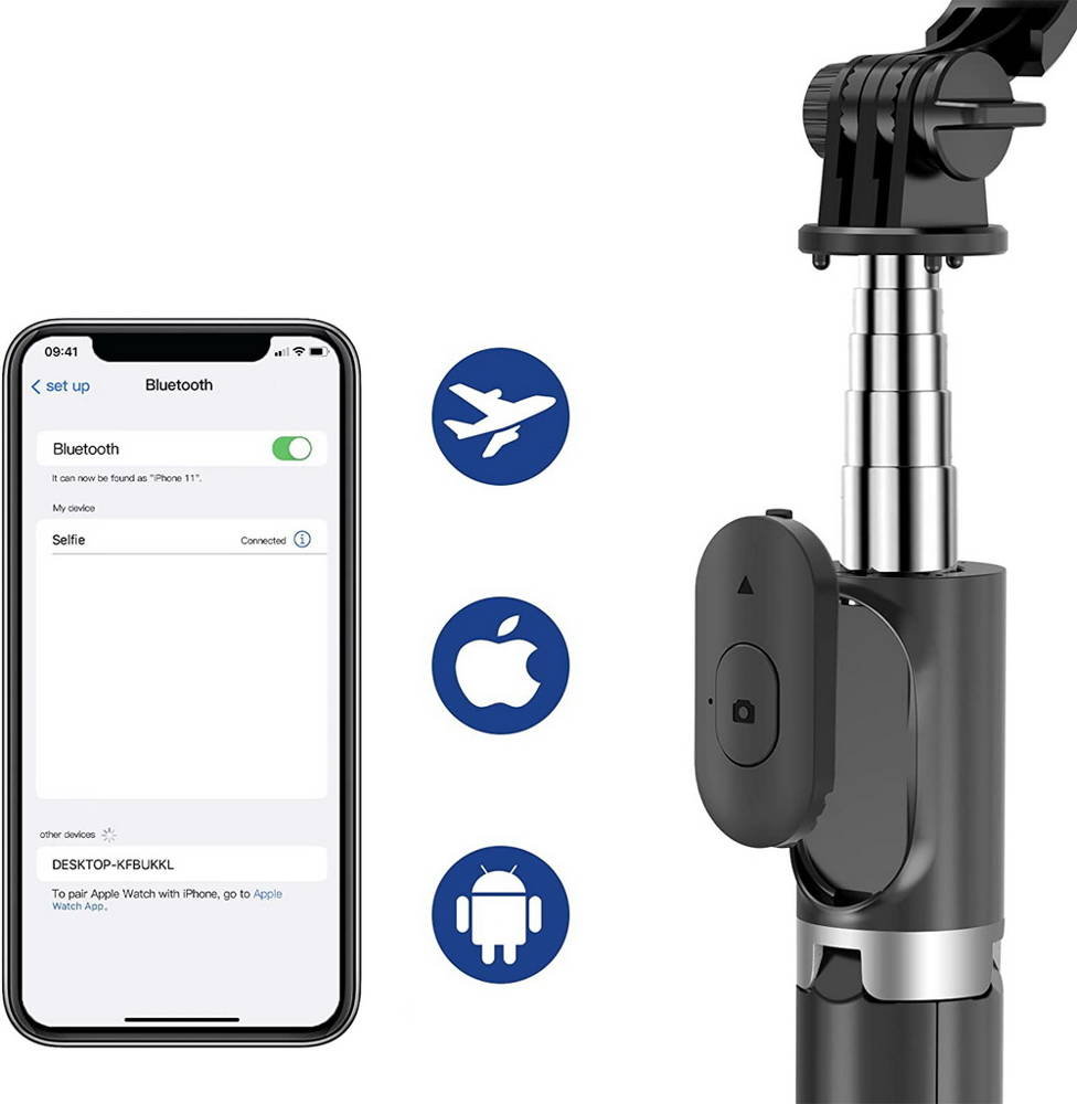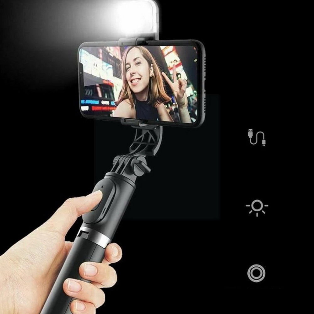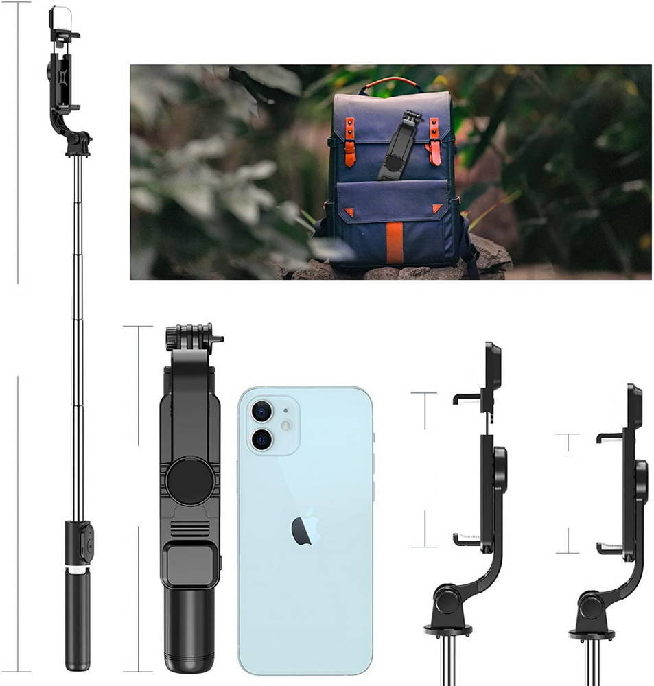 - Selfie stick do robienia zdjęć z funkcją statywu, pilotem Bluetooth oraz dodatkowym doświetleniem LED