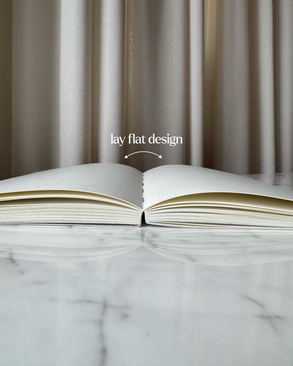 Jego unikalna oprawa z odsłoniętym grzbietem w stylu lay flat design pozwala na pełne otwarcie notesu, zapewniając maksymalny komfort pisania – niezależnie od tego, gdzie i jak go używasz. Całości dopełniają ozdobne nici w odcieniach inspirowanych naturą: ziemiste barwy harmonijnie łączą się z minimalistycznym stylem notesu, nadając mu subtelny, elegancki charakter.