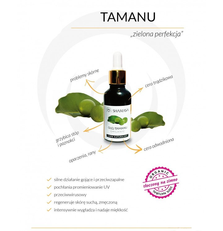 Shamasa Olej tamanu, 30 ml silne działanie gojące i przeciwzapalne; pochłania promieniowanie UV; regeneruje skórę suchą i zmęczoną; zabezpiecza warstwę hydrolipidową; intensywnie wygładza i nadaje