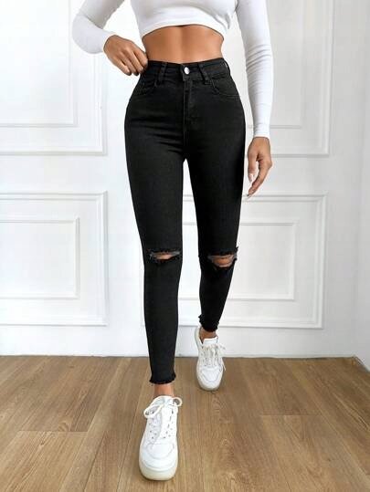 SHEIN JEANSY Z DZIURAMI CZARNE DLA NISKICH KOBIET Opis ProduktuMarka SheinKolor czarnySkład 97% bawełna 3% elastanMetka papierowa BrakMetka wewnętrzna TakRozmiar LCena katalogowa