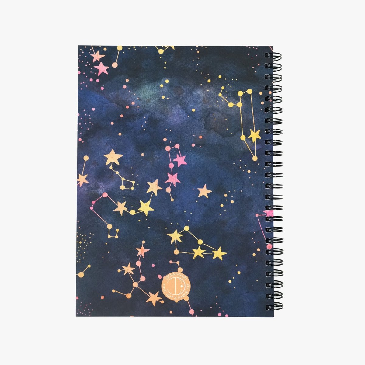 Obraz na okładce kołozeszytu jest połączeniem pracy namalowanej farbami akwarelowymi i ręcznie rysowanych gwiazdozbiorów. W ten sposób powstały pomarańczowo-różowe gwiazdy migoczące na tle głębokiej, ciemnej nocy.