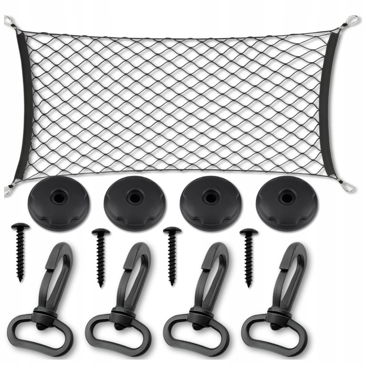 ✅ Montaż jest szybki i prosty – dołączone karabińczyki, śruby i zaczepy pozwalają na solidne i trwałe zamocowanie w bagażniku. Siatka samochodowa do bagażnika z zestawem montażowym nie wymaga dodatkowych narzędzi, co czyni ją wyjątkowo praktyczną.