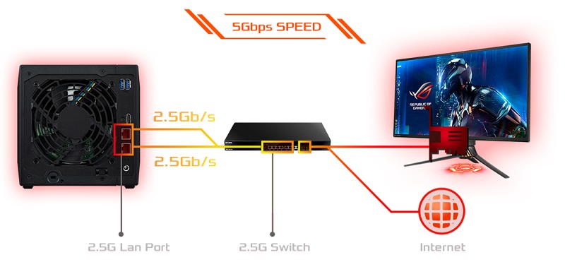 2.5-Gigabit Ethernet. W przypadku maks. dostępnej przepustowości jest to skok wydajności o 150% w przypadku do standardowego rozwiązania sieci Gigabit Ethernet. To nie jest jednak szczyt możliwości tego serwera NAS – włączając funkcję agregacji łączy* użytkownik otrzymuje do dyspozycji maks. przepustowość równą 5Gbps.