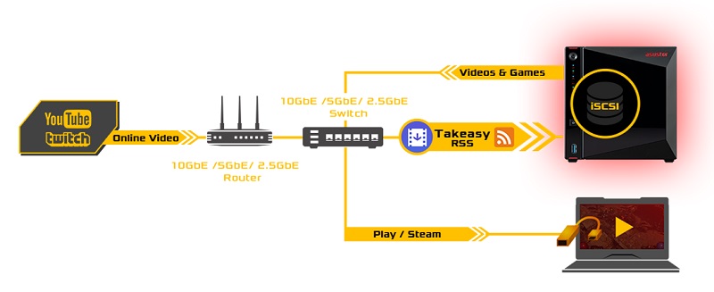 Nowej serii urządzenia ASUSTOR NAS oferują zapis strumieniowy, na żywo, w rozdzielczości do 4K UHD HDR, tak aby te pliki można było zapisać bezpośrednio na serwerze NAS, bez wpływu na wydajność gry. Dla graczy / firm nie dysponujących dyskami HDD o dużej pojemności system operacyjny ADM oferuje wykorzystanie technologii iSCSI do przechowywania mniej obszernych filmów / streamów, które można później dowolnie odtwarzać na wielu urządzeniach, jednocześnie.