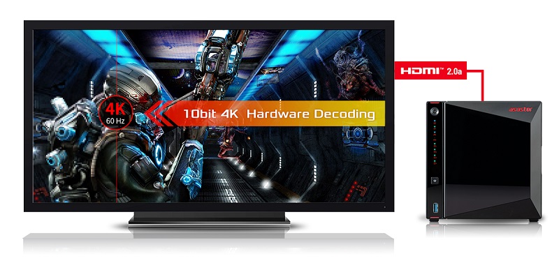 Serwer AS5304T wyposażony jest w gniazdo HDMI 2.0az 10-bitowym dekodowaniem sprzętowym 4K, dekodowaniem HEVC oraz VP9 10bit Profile2, co w efekcie zapewnia płynniejsze działanie i mniejsze obciążenie procesora. Do odtwarzania materiałów wideo w najwyższej jakości 4K UHD HDR wykorzystaj odtwarzacz Plex Pass lub inny kompatybilny z taką rozdzielczością obrazu.