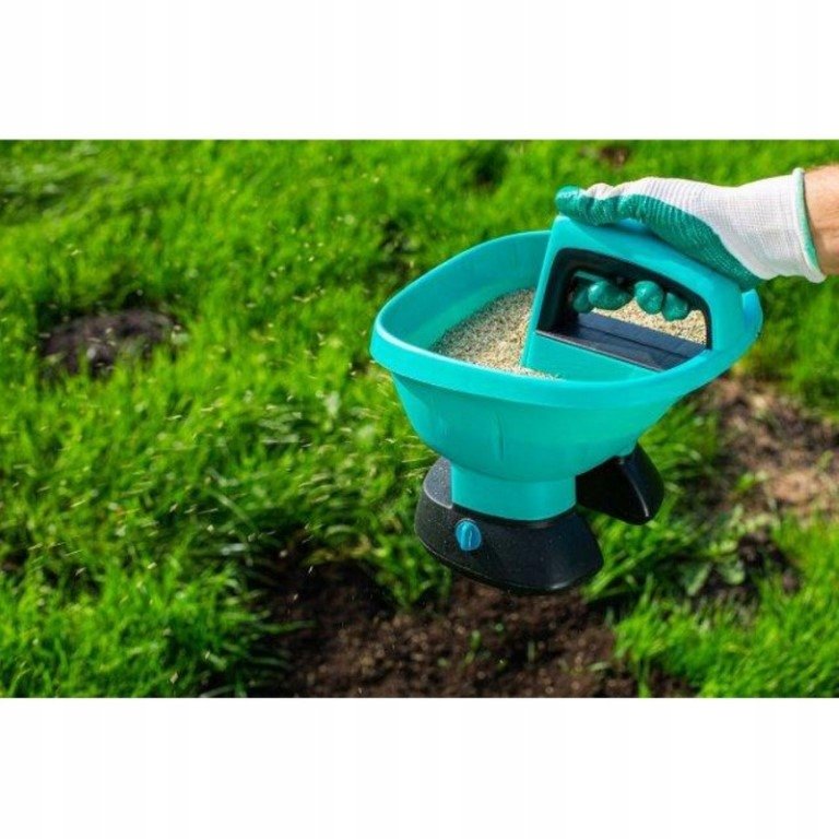 Siewnik ogrodowy rotacyjny elektryczny o pojemności 2,7 litra przeznaczony do rozsiewania nawozów oraz wysiewania nasion