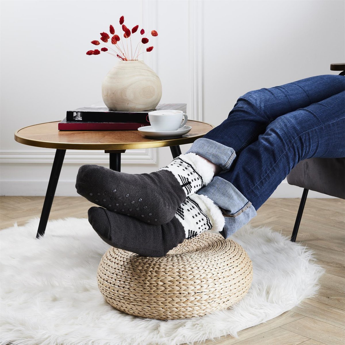 - Nowoczesny, brązowy wzór sprawia, że skarpety są stylowym dodatkiem do domowego stroju