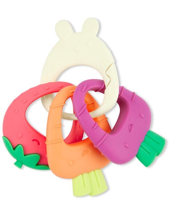 Zestaw gryzaków połaczonych ze sobą klipsem. Gryzaków nigdy za wiele, a najlepsze gryzaki dla niemowląt to przede wszystkim angażujące kształty, kolory i faktury. Ten uroczy gryzak dla niemowląt wyposażony jest w przyjazne dla ząbkujących, miękkie, silikonowe gryzaki w kształcie owoców i warzyw, które nadają mu nowego, świeżego charakteru. Przypnij kolorowe owoce i warzywa do uroczego klipsa w kształcie króliczka, przymocuj do wózka, nosidełka lub torby, a zawsze będziesz mieć pod ręką ciekawy sposób na zajęcie rączek dziecka, gdziekolwiek jesteś.