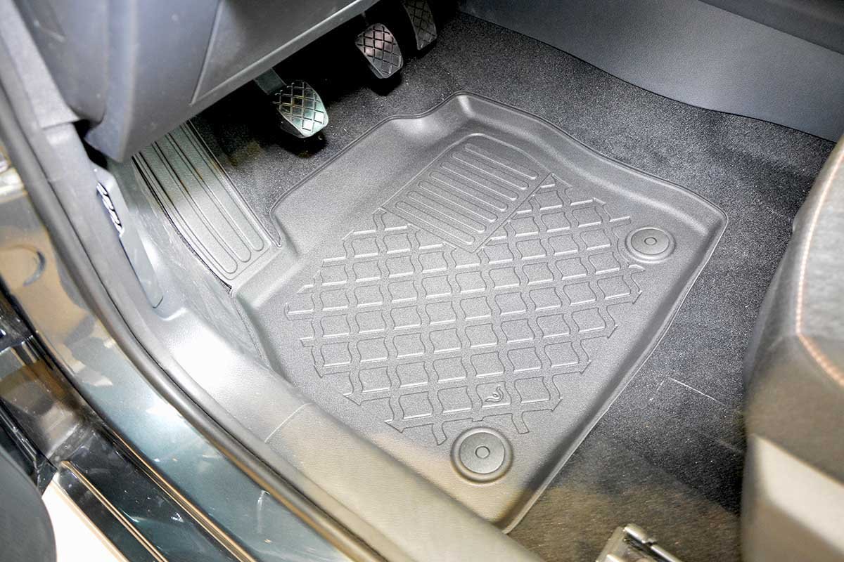 Oferowane dywaniki zostały precyzyjnie zaprojektowane do kształtu płyty podłogowej biorąc pod uwagę nie tylko markę / model samochodu, ale także rocznik oraz wersję nadwozia, dzięki czemu pasują idealnie. Dywaniki wytwarzane są z najwyższej jakości, trwałego i wzmocnionego tworzywa sztucznego, niezawierającego substancji szkodliwych dla zdrowia, co zapewnia bezpieczeństwo użytkowania. Wysoki kołnierz (brzeg) ochronny dookoła dywaników oraz stabilność kształtu skutecznie zatrzymuje wodę i brud, zabezpieczając oryginalną tapicerkę samochodową przed zabrudzeniem. Bezpieczne w użytkowaniu, dzięki praktycznemu i łatwemu w użyciu systemowi mocowania do podłogi samochodu. System mocowania dostosowany jest do marki / modelu samochodu i zabezpiecza dywanik przed przesuwaniem podczas jazdy. Matowe wykończenie oraz dopracowany wzór na powierzchni zapewniają estetyczny wygląd dywaników w samochodzie.