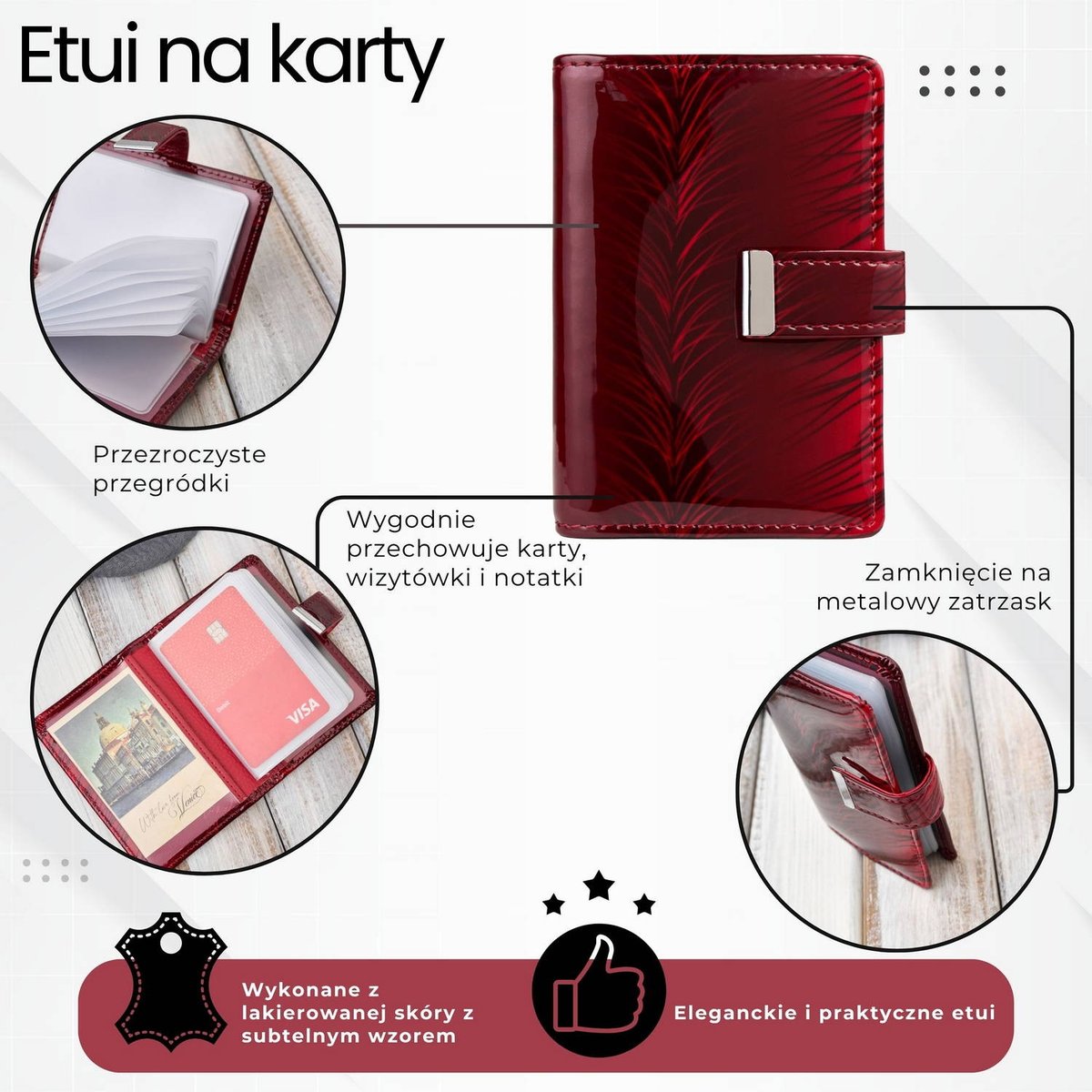 Zapięcie na metalowy zatrzask, osadzone na skórzanej patce, zapewnia bezpieczeństwo przechowywanych kart. Patka została ozdobiona ozdobnym szwem w zygzak, wykonanym w tonacji czerwieni – drobny akcent, który subtelnie przełamuje klasyczną linię projektu i dodaje mu wyjątkowego wyrazu.