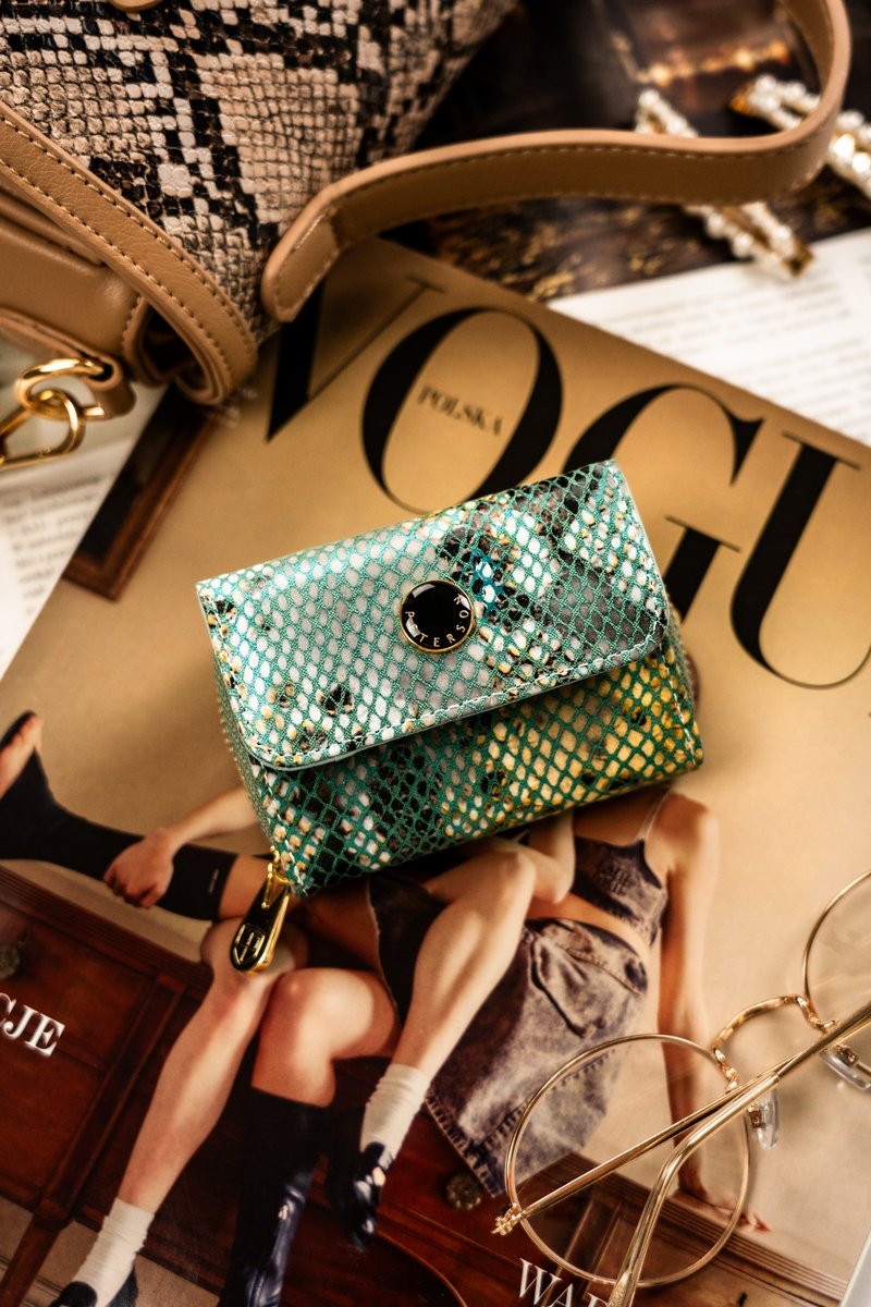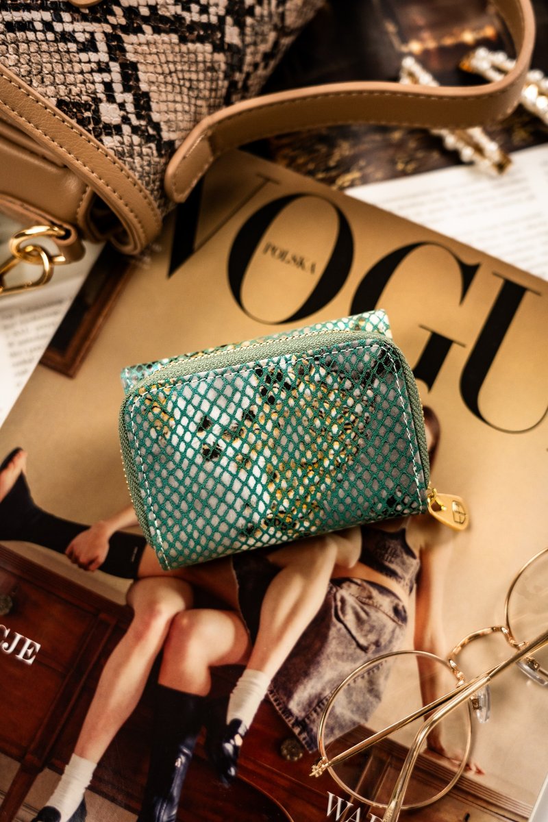 #️⃣ Skóra naturalna | Jego głównym elementem jest tekstura przypominająca siatkę w odcieniu niebieskim, co sprawia, że tło z mieniącymi się złotymi i szarymi akcentami przypomina wężową skórę. Portfel ma elegancki, połyskujący wygląd, co nadaje mu luksusowego charakteru. Na przedniej części widoczny jest błyszczący, elegancki emblemat, który dodatkowo podkreśla markowy charakter produktu. Zapięcie suwaka ozdobione piękną, złotą zawieszką z logo.