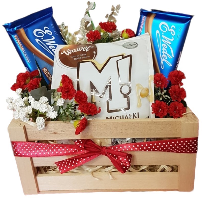 Zawartość skrzyneczki: E. Wedel, 2 czekolady 90-100 g (2 różne) Michałki z Wawelu białe, 280 g Sztuczne kwiaty Oferowane przez nas skrzyneczki mają podkład w postaci wełny drzewnej i są ...
