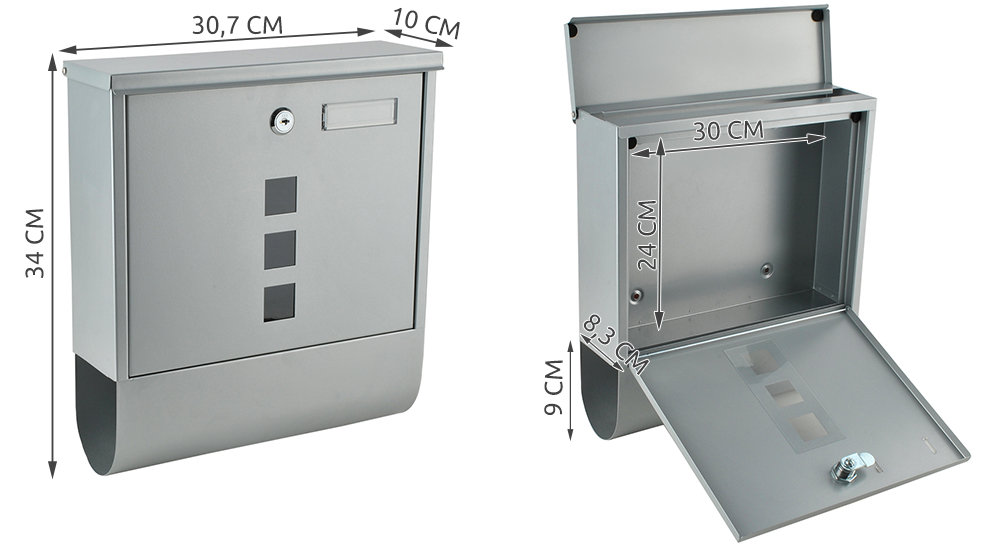 - SPECYFIKACJA - kolor: szary; dominujący materiał: żelazo ocynkowane, pozostałe: akryl + aluminium + EVA) + 2 klucze (stop cynku + ABS); format: A4; wymiary: 10 x 30,7 x 34 cm; waga skrzynki: 1,95 kg; waga w opakowaniu: 2,2 kg.