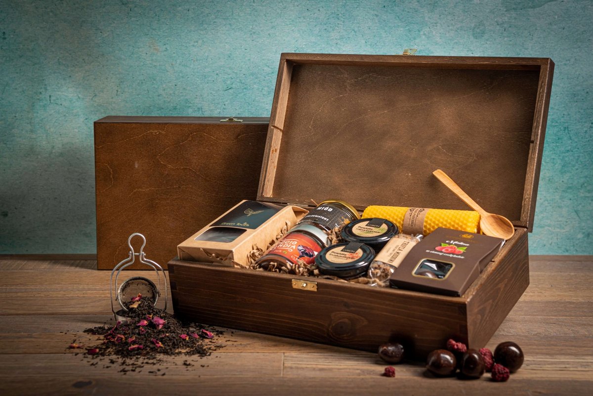 Wszystko starannie zapakowane w lakierowaną na ciemny brąz skrzynkę sosnową ze złotym zamknięciem. Wewnątrz produkty otulone są papierową wyściółką.