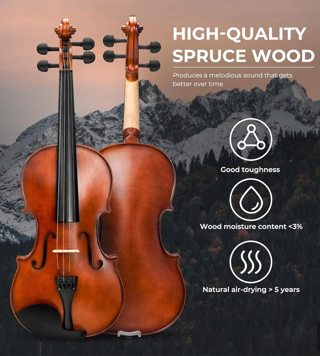 Górna część skrzypiec akustycznych Vangoa wykonana jest ze świerku, który jest doskonałym materiałem do wykonania instrumentu muzycznego ze względu na niewielką wagę, niskie tarcie wewnętrzne i wysoką jakość reakcji częstotliwości.