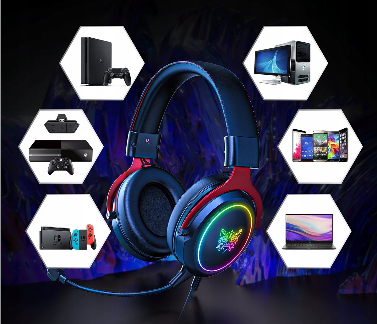 Zestaw słuchawkowy Onikuma zapewnia kompatybilność z większością urządzeń dostępnych na rynku (pełne okablowanie w zestawie!)