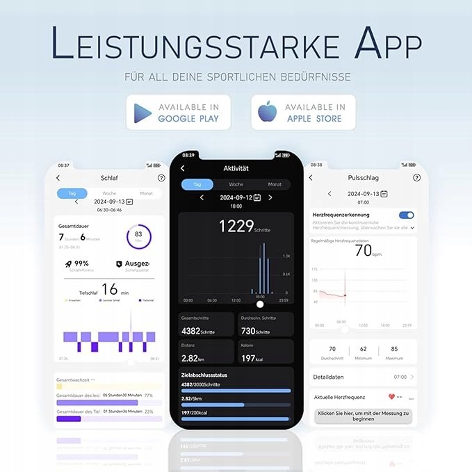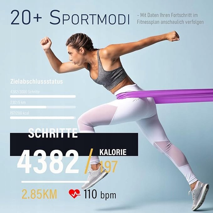 - Inteligentna aplikacja: Synchronizacja z danymi w telefonie komórkowym poprzez aplikację kompatybilną z Android i iOS. Aplikacja oferuje szczegółowe wykresy monitorujące postępy w aktywności i stanie zdrowia.