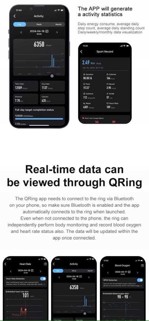 INTUICYJNA, PRZEJRZYSTA APLIKACJA QRINGDane w czasie rzeczywistym dostępne przez aplikację QRing. Nawet jeśli pierścień nie jest aktualnie połączony z telefonem, potrafi niezależnie monitorować organizm, rejestrować poziom tlenu we krwi oraz tętno. Dane zostaną zsynchronizowane z aplikacją przy następnym połączeniu.