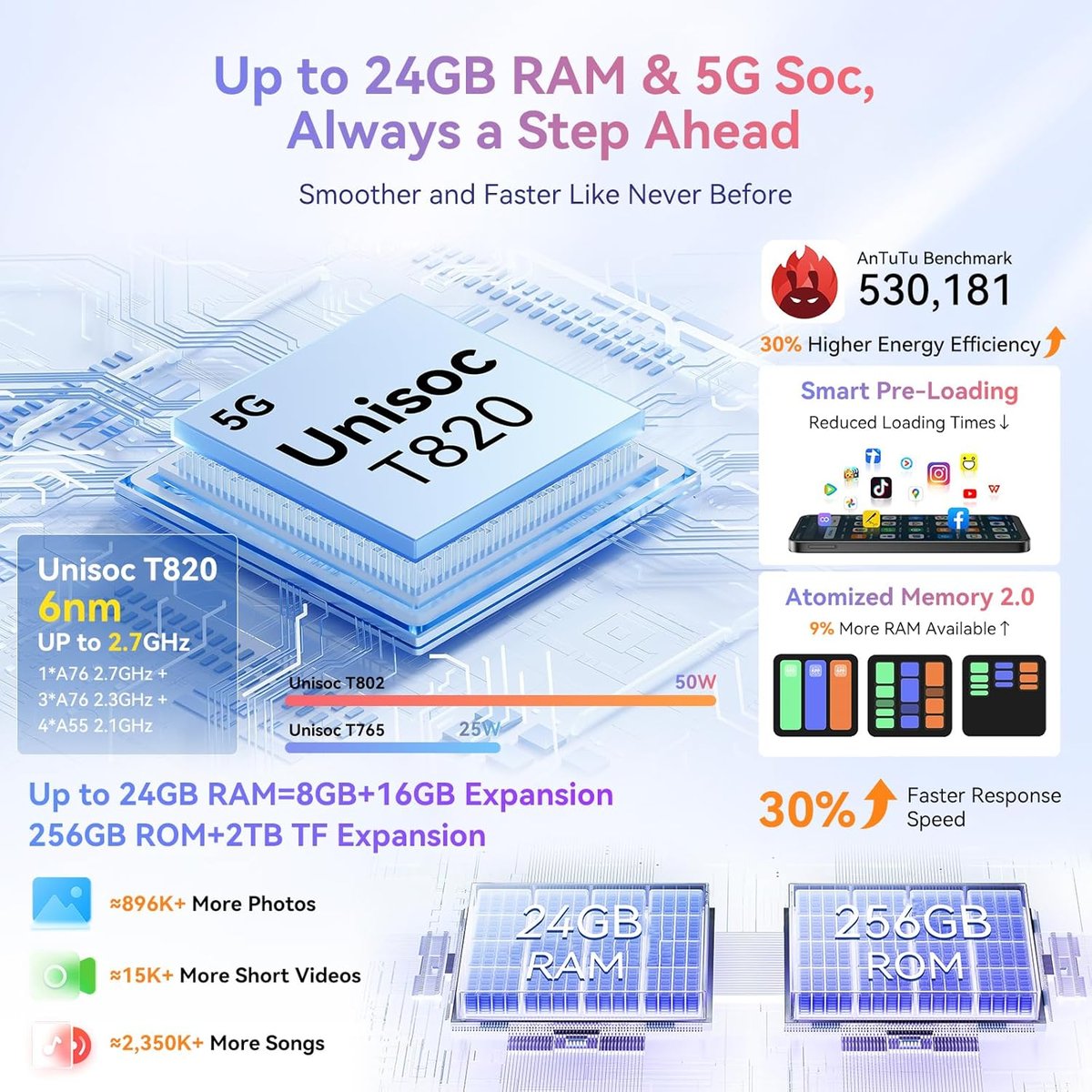 CPU: Ośmiordzeniowy Unisoc UMS9620S (T820), do 2,7 GHz