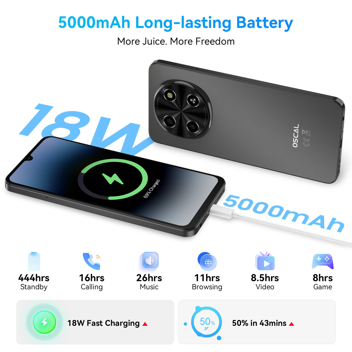 Wytrzymała bateria: Telefony komórkowe OSCAL dostępne obecnie w sprzedaży posiadają wbudowaną baterię o pojemności 5000 mAh, w połączeniu z inteligentnym systemem zarządzania energią, co zapewnia stabilną i długotrwałą wydajność, spełniając wymagania całodziennego intensywnego użytkowania. Obsługa szybkiego ładowania 18 W (9 V/2 A) znacznie skraca czas ładowania i zmniejsza obawy o zużycie energii. Rzeczywisty czas pracy baterii: 4,7 godziny ciągłej gry, 6,4 godziny odtwarzania wideo, 15,6 godziny odtwarzania muzyki i wydłużony czas czuwania do 478 godzin (Uwaga: ładowarka nie jest dołączona).