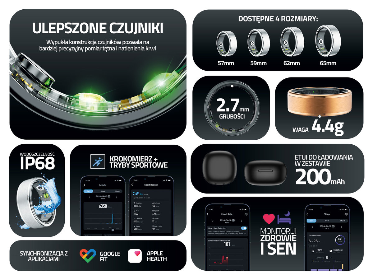 Ulepszone czujniki w smart ringach z wypukłą konstrukcją zapewniają bardziej precyzyjne monitorowanie tętna oraz poziomu natlenienia krwi. Dzięki temu użytkownik zyskuje dokładniejsze dane zdrowotne, co wspiera lepsze zarządzanie kondycją i samopoczuciem.