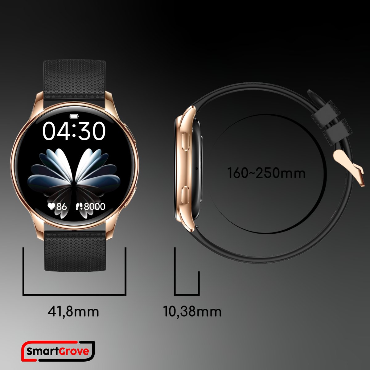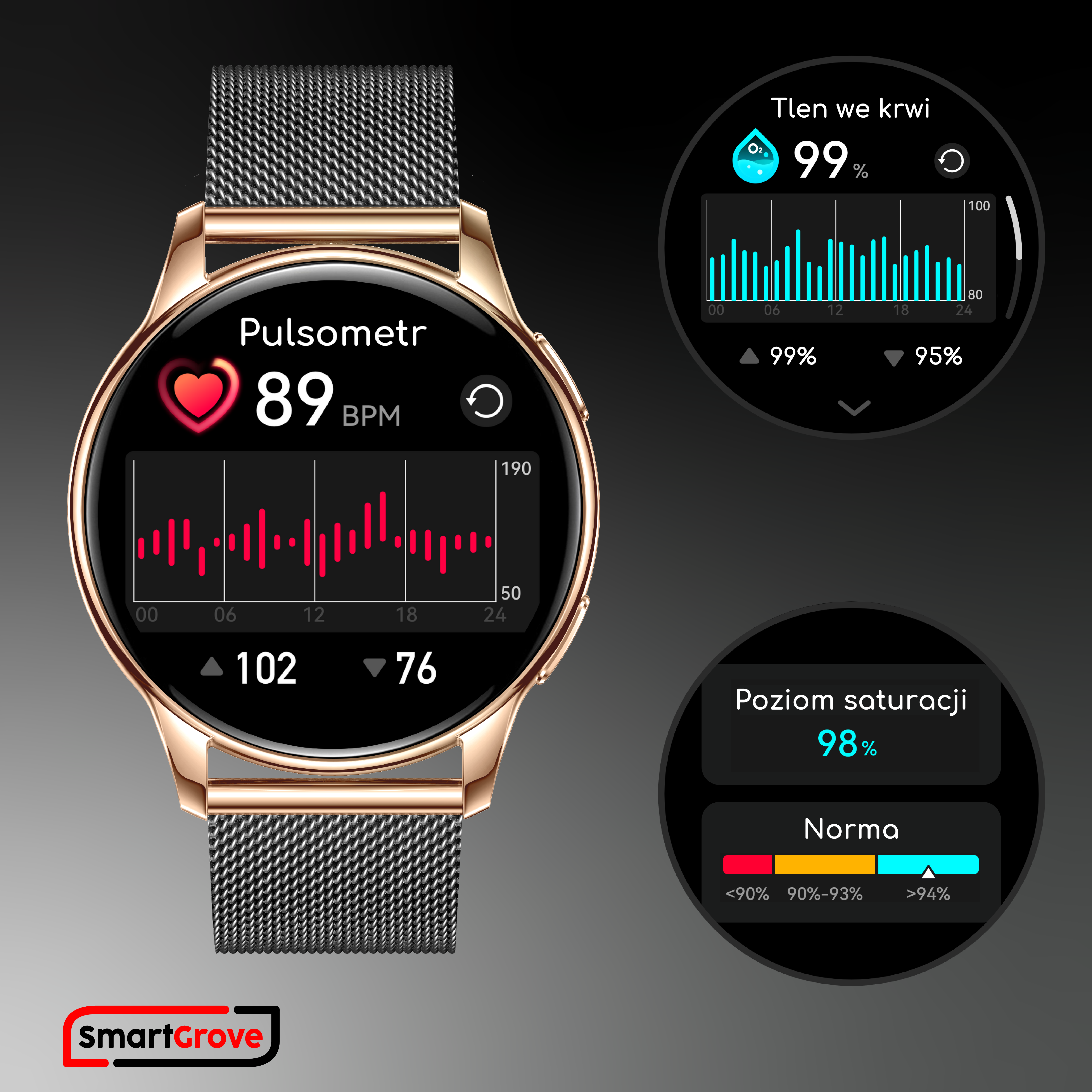 czarno-złotym w zestawie z czarno-złotym silikonowym paskiem. Wyróżnia się bogatym zestawem funkcji i dopracowanym designem, idealnie łącząc styl z funkcjonalnością.