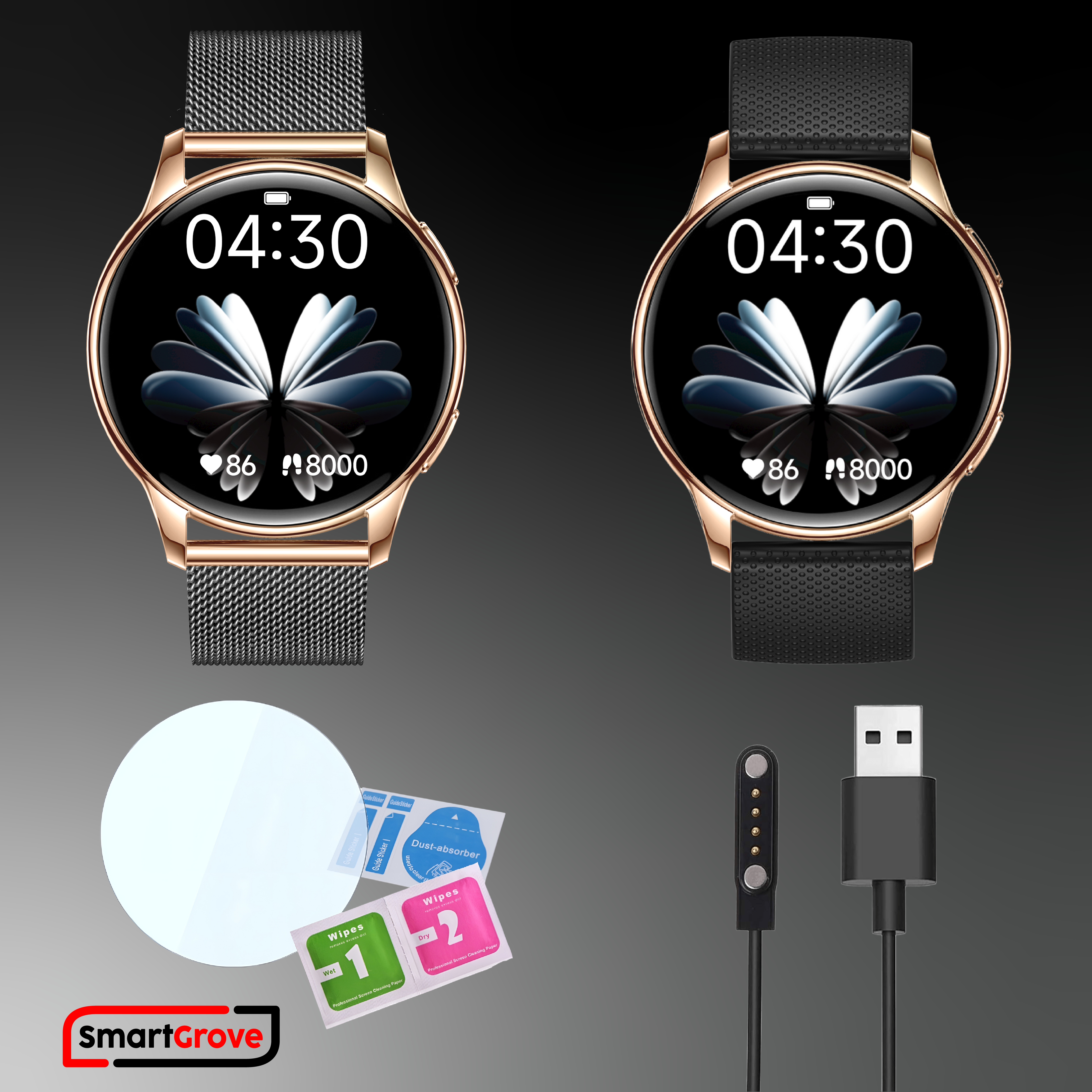 Elegancki i nowoczesny smartwatch z kopertą oraz metalową bransoletą w kolorze czarno-złotym w zestawie z czarno-złotym silikonowym paskiem. Wyróżnia się bogatym zestawem funkcji i ...