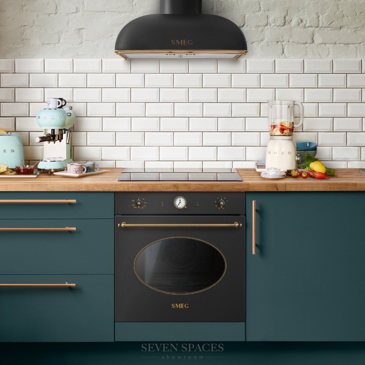 Piekarnik elektryczny firmy Smeg z linii wzorniczej Coloniale, z Termoobiegiem i czyszczeniem prolitycznym w kolorze antracytowym z wykończeniami mosiądzem polerowanym, 60cm.