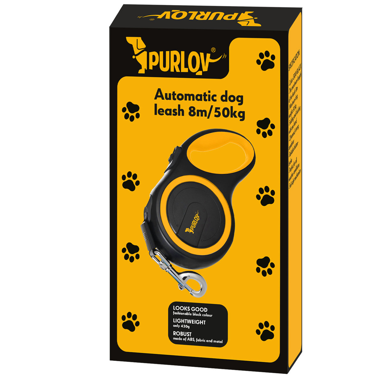 - materiał: ABS, pozostałe: TPR + poliester + stop cynku; maksymalna waga psa: 50kg; szerokość taśmy: 1,5cm; wymiary: 24 x 11 x 4cm; długość taśmy: 8m; waga: 430g; waga w opakowaniu: 491g.