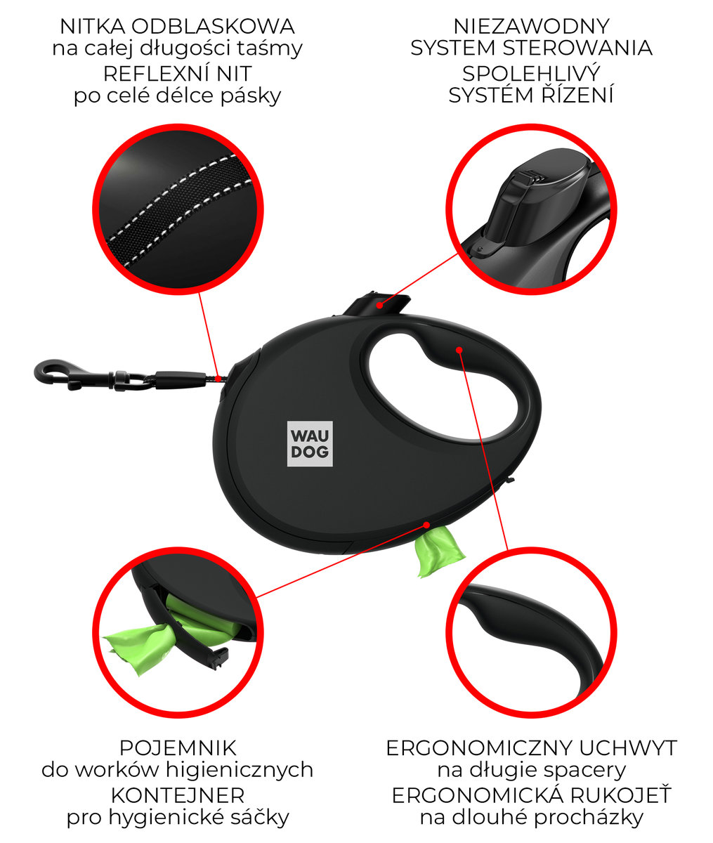 Smycz automatyczna dla psa WAUDOG R-leash pozwoli Twojemu pupilowi cieszyć się wolnością na bezpiecznym dystansie, a Tobie regulować odległość i w odpowiednim momencie zablokować taśmę na określonej długości. Wyposażony w wygodny pojemnik na worki i taśmę odblaskową, co znacznie zwiększa komfort i bezpieczeństwo podczas spacerów.