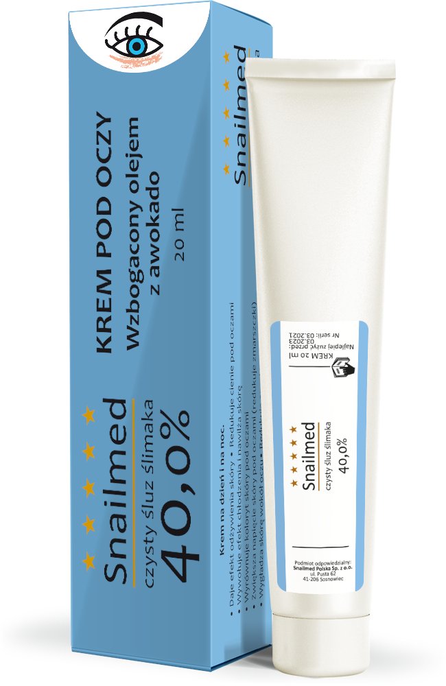 Regularnie stosowany Naturalny pielęgnacyjny krem pod oczy, wzbogacony olejkiem z awokado na bazie naturalnego, czystego śluzu ślimaka w wysokim stężeniu 40%” marki Snailmed: