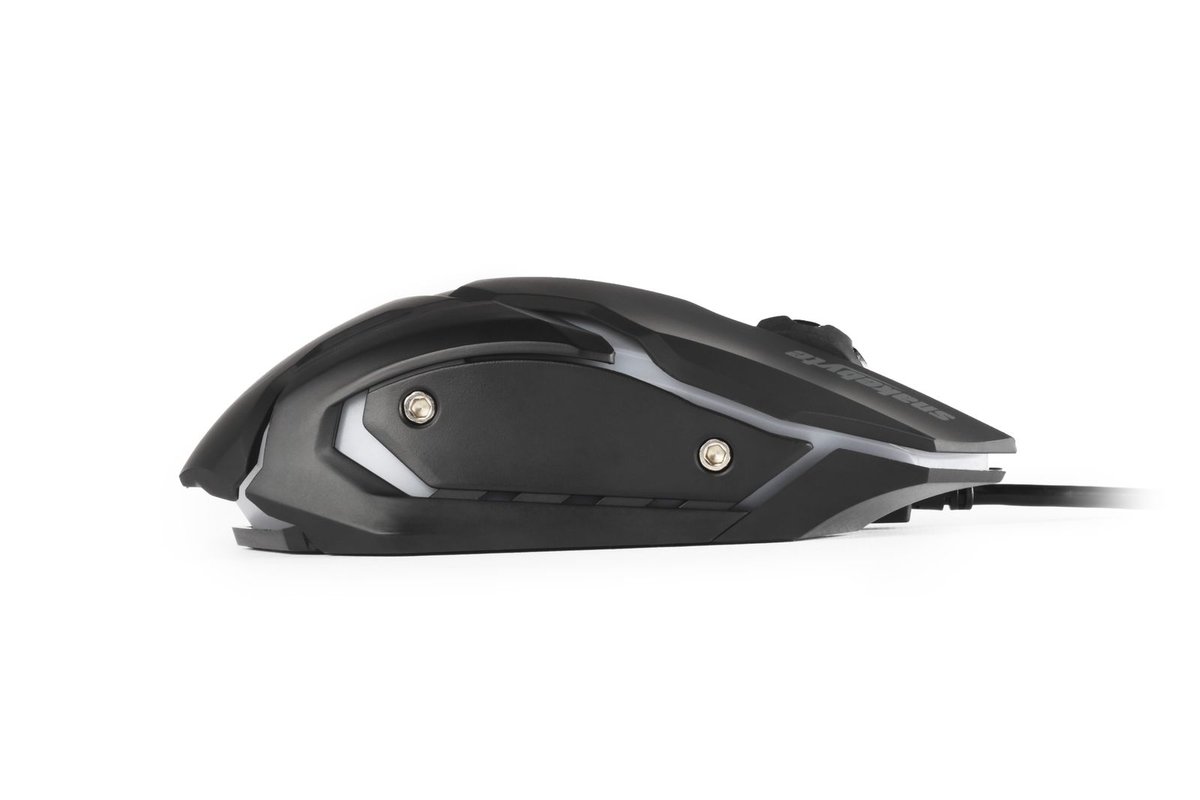 Mysz optyczna dla graczy z podświetleniem LED i regulowanym czujnikiem optycznym w zakresach 800/1200/1600/2400 DPI o metalowej powierzchni ślizgowej.