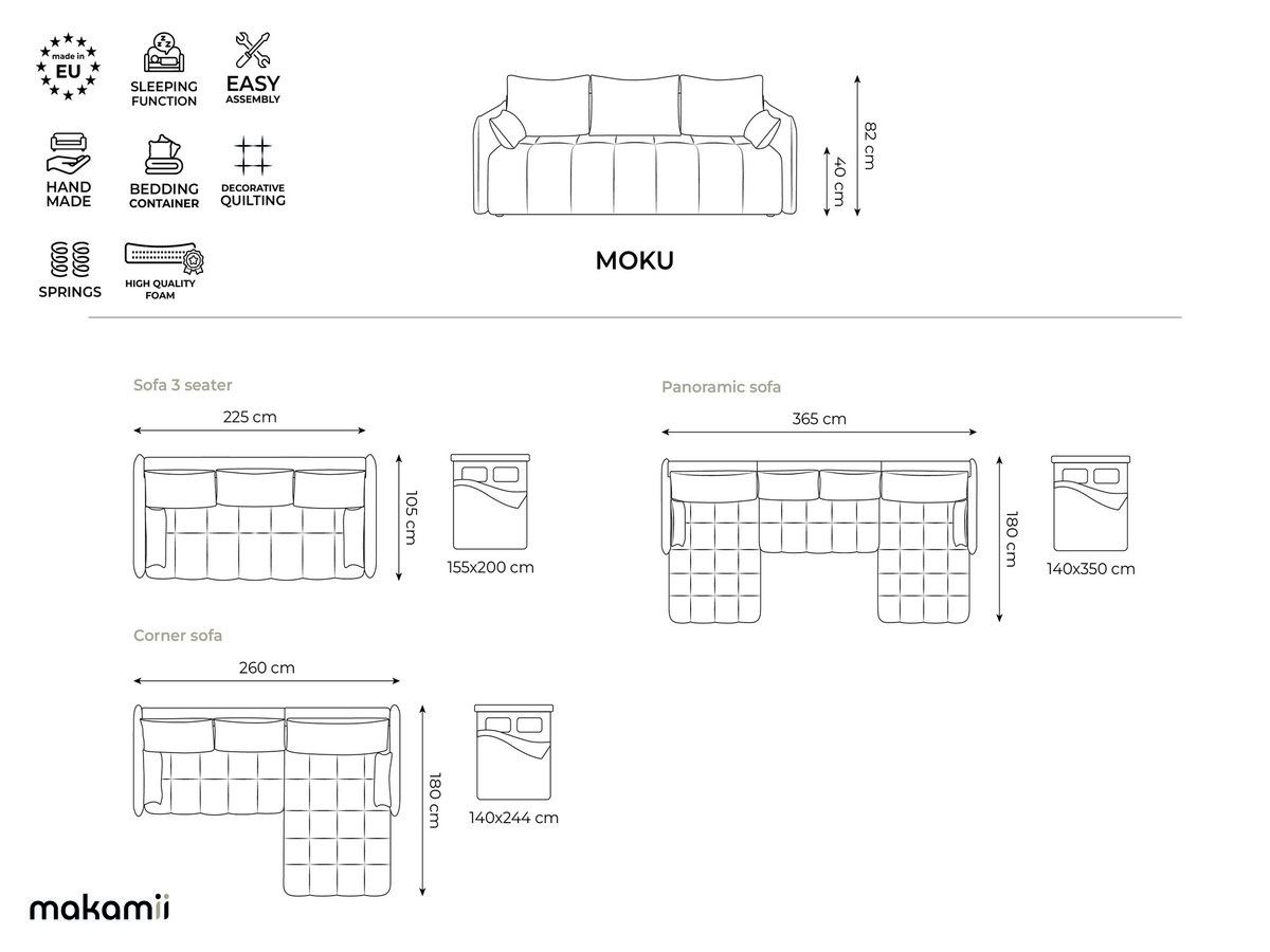 Przestronna podstawa łóżka pod siedziskiem oferuje miejsce do przechowywania poduszek, koców lub pościeli. Konstrukcja wykonana z drewna sosnowego i powlekanych materiałów drewnianych zapewnia solidną podstawę o nośności do 350 kg. Siedzisko tapicerowane jest pianką poliuretanową (28 kg/m³), a oparcie pianką o gęstości 25 kg/m³ - co zapewnia długotrwały komfort i stabilność wymiarową.