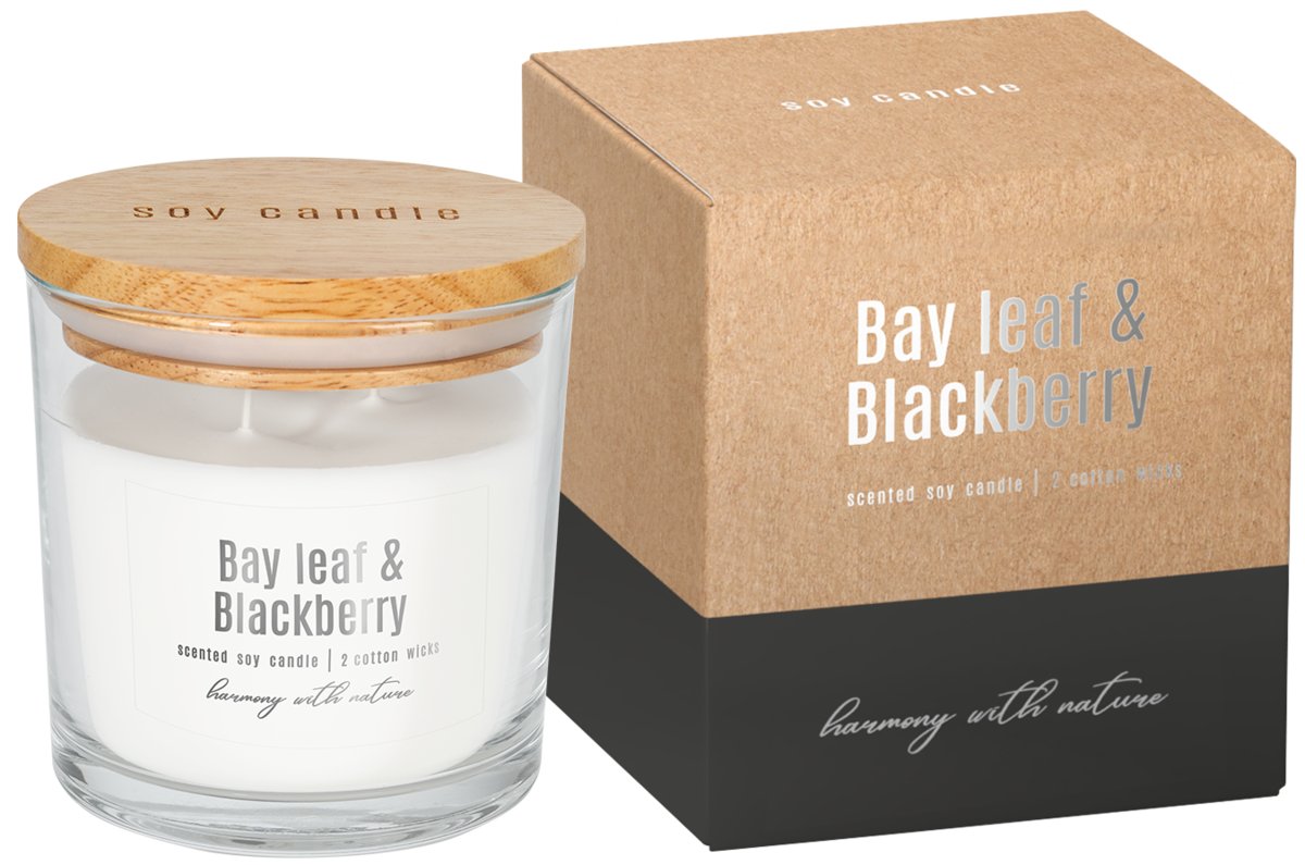 Sojowa świeca zapachowa w szkle z wieczkiem, o zapachu liścia laurowego i jeżyny oraz czasie palenia do 40 godzin BISPOL.