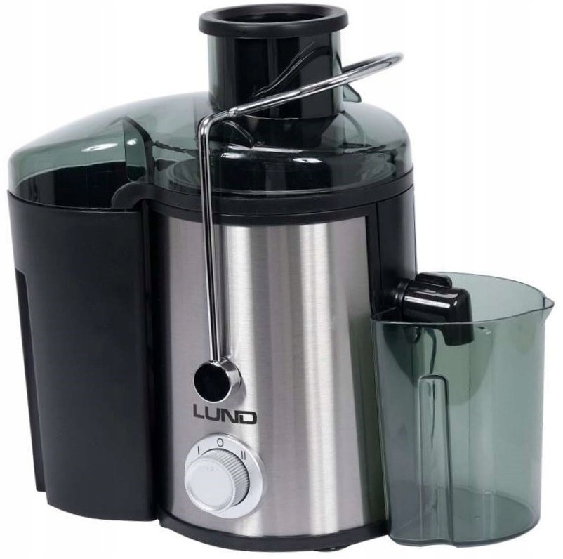 Wysokoobrotowa sokowirówka marki LUND z wydajnym silnikiem o mocy 600W oraz 2-poziomową regulacją prędkości do 13000 obrotów/minutę. Otwór wlotowy o szerokości 65 mm pozwala na wrzucanie dużych kawałków owoców i warzyw. Dodatkowym atutem jest kranik wylotowy z zabezpieczeniem przed kapaniem soku. Antypoślizgowe nóżki dają stabilność urządzenia podczas pracy.