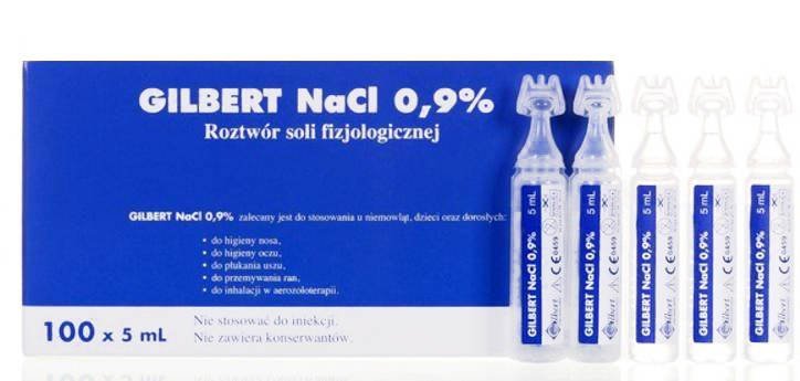 GILBERT NACL 0.9% Fizjologiczny roztwółr soli - 100 amp. Może być stosowany do codziennego oczyszczania i nawilżania nawet bardzo wrażliwych miejsc, takich jak okolice oczu czy błona śluzowa nosa u ...