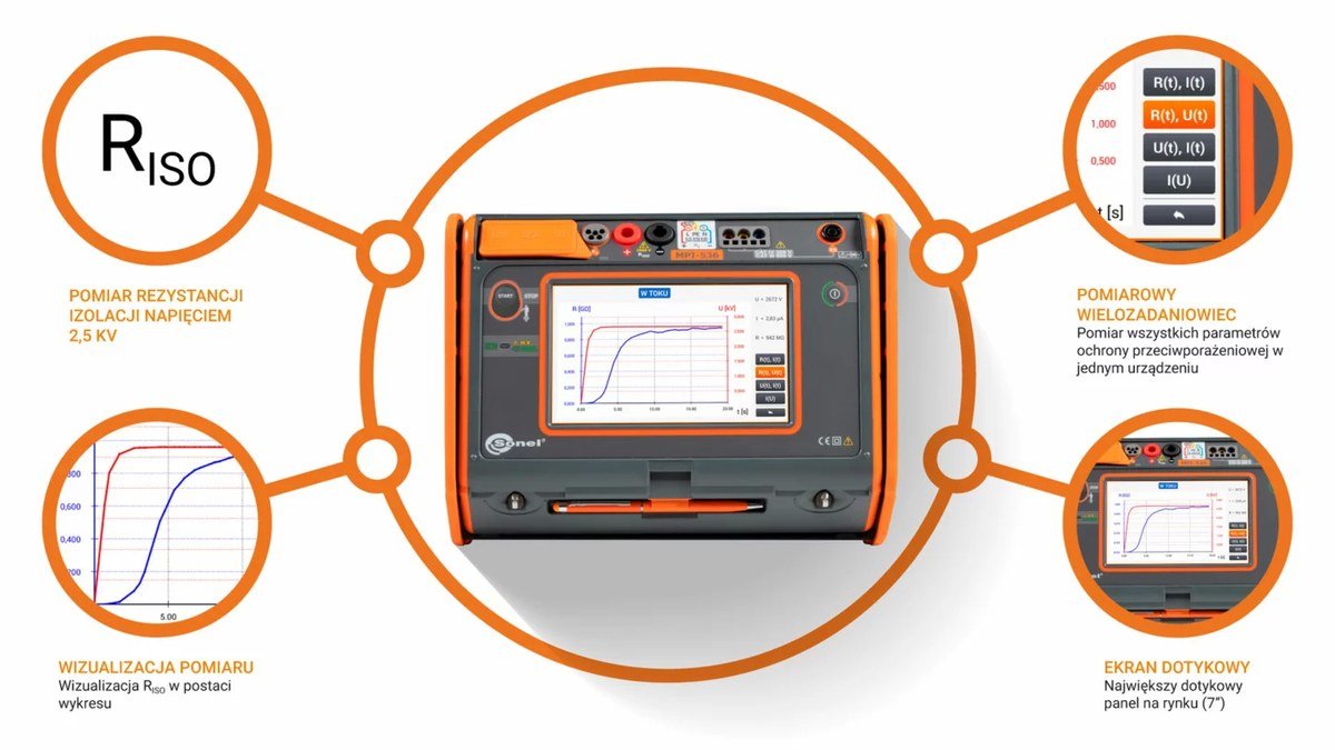 - Diagnostykę izolacji wspomagają wykresy R(t)/U(t), R(t)/I(t), U(t)/I(t), I(U), dostępne zarówno po, jak i w trakcie wykonywania pomiaru. Ponadto przyrząd wylicza współczynniki absorpcji oraz współczynniki temperaturowe. Dodatkowo Sonel MPI-536 umożliwia automatyczny pomiar rezystancji izolacji przewodów lub kabli 3-, 4- lub 5- żyłowych przy wykorzystaniu opcjonalnego adaptera AutoISO-2500.