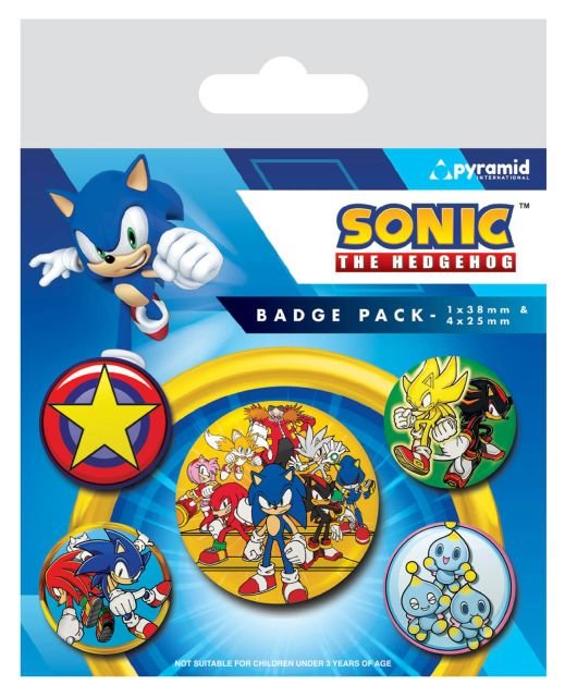 SONIC HEDGEHOG SPEED TEAM - zestaw 5 przypinek ubraniowych o średnicach 1 sztuki 38 mm i 4 sztuki 25 mm. Zapakowane w kolorowy blister o rozmiarze 10x12,5cm, z grafiką nawiązującą do tematyki ...