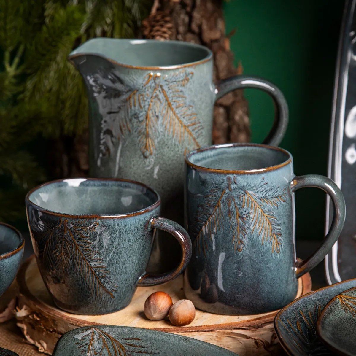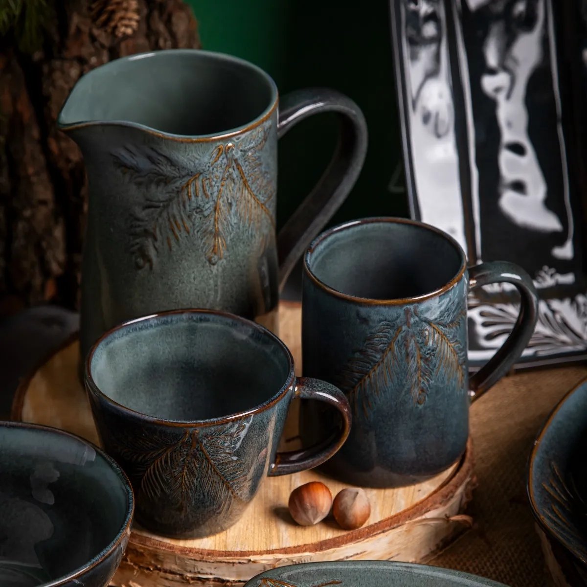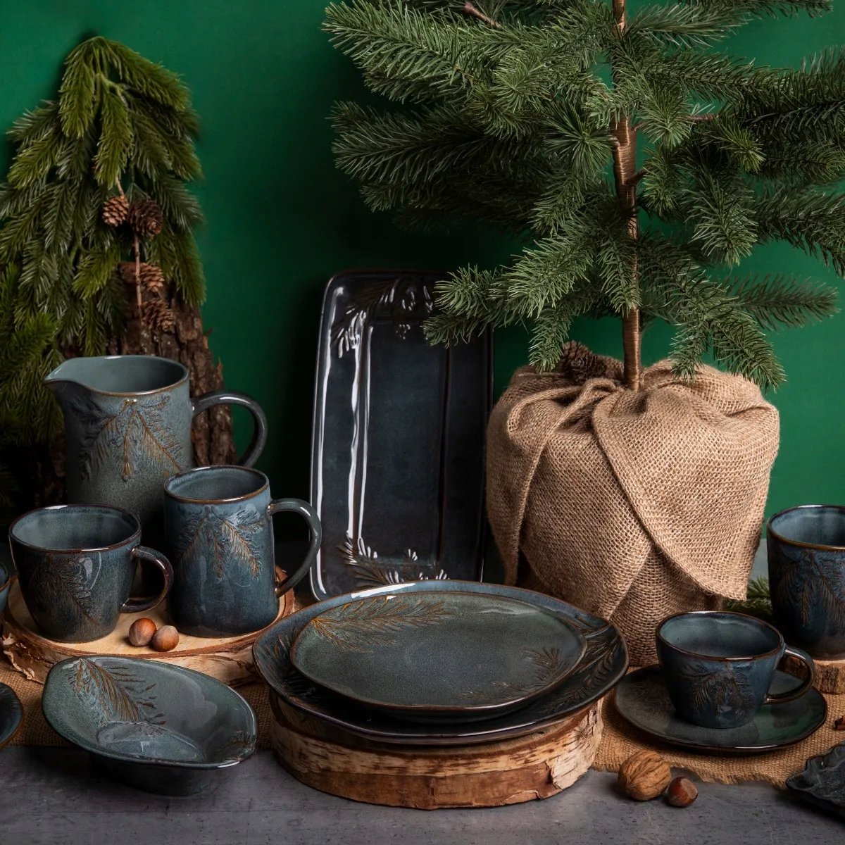 Kolekcja Sosnowy Las to wyjątkowy zestaw naczyń, który oddaje hołd pięknu natury i tajemniczej atmosferze sosnowych lasów. Każdy element tej serii został starannie zaprojektowany, by wiernie oddać urok sosnowych gałęzi za pomocą nowoczesnej technologii, która umożliwia tworzenie wypukłych, trójwymiarowych tłoczeń. Kolorystyka kolekcji, obejmująca bogate granaty, stonowane szarości oraz ciepłe brązy, w połączeniu z subtelnymi reliefami, wprowadza do wnętrz niezwykły, leśny nastrój.