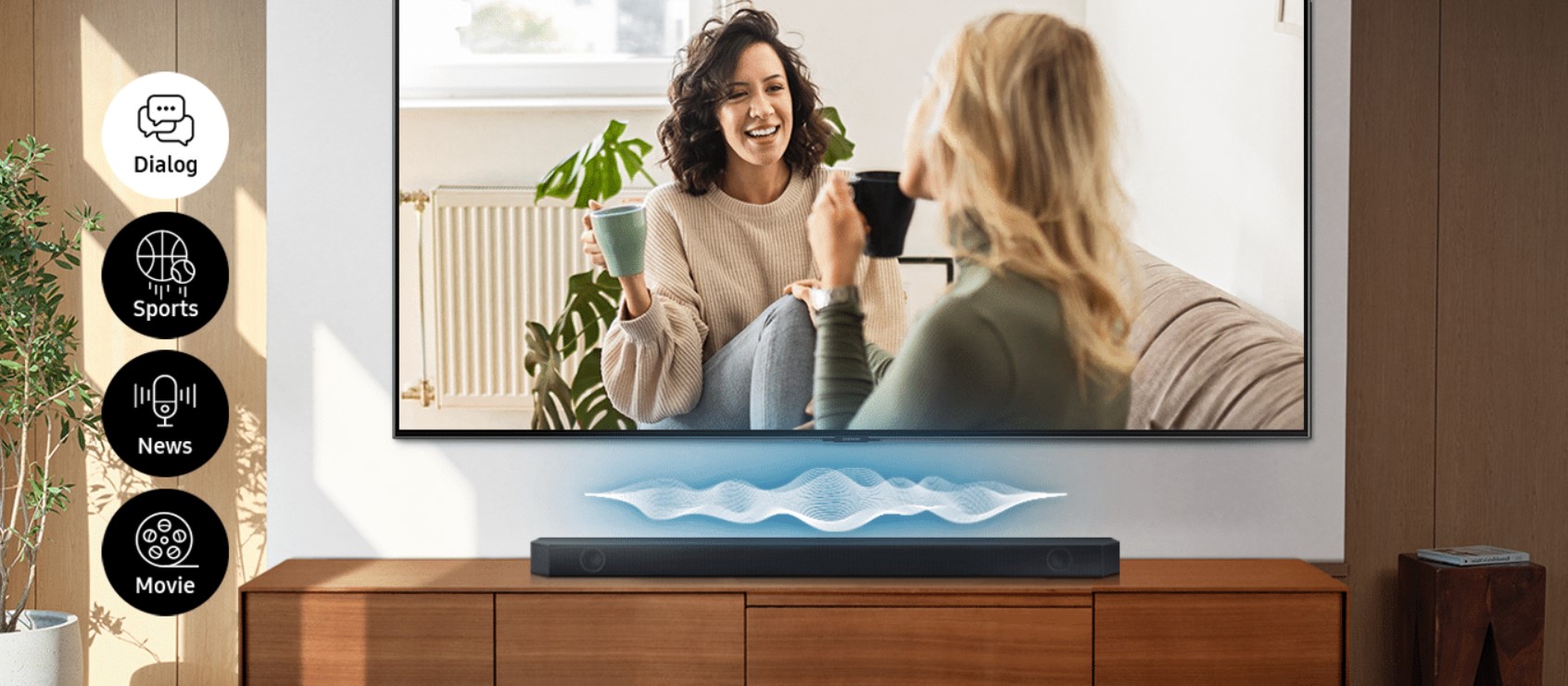 Posłuchaj, jak Twój soundbar i głośniki telewizora harmonijnie współbrzmią! Q-Symphony, jedna z najbardziej innowacyjnych funkcji Samsung, pozwala na jednoczesną pracę głośników telewizora i soundbara. Ulepszona technologia Q-Symphony zapewnia zoptymalizowany dźwięk ze wszystkich kanałów, a sztuczna inteligencja remasteruje obiekty dźwiękowe wyodrębnione z oryginalnego źródła audio. To wszystko dla jeszcze lepszych doznań dźwiękowych!