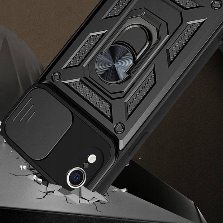Etui Spacecase CamRing do iPhone XR czarny Pancerne etui CamRing to doskonała ochrona Twojego urządzenia. Wbudowany przesuwny slider skutecznie zabezpiecza powierzchnię aparatu przed zarysowaniem lub